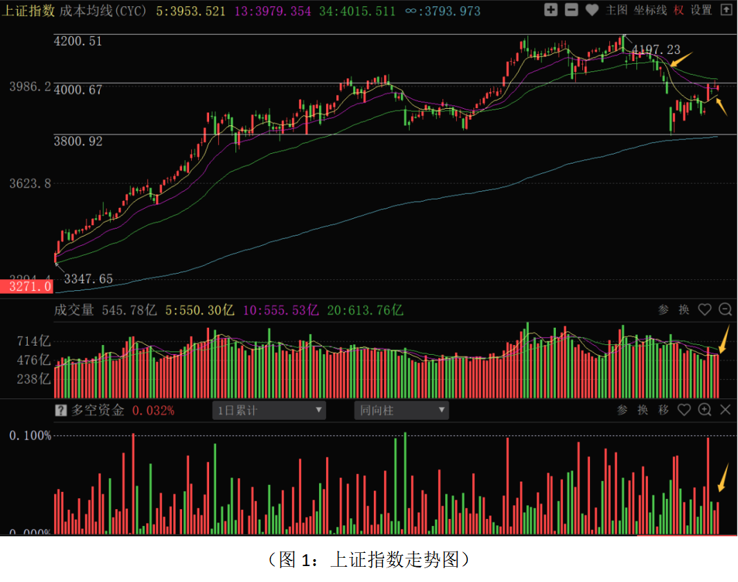 从上证指数来看,昨日股指小幅低开之后,震荡小涨,多空资金净流入145.43亿元,在美伊谈判没有达成协议,以及特朗普表态封锁霍尔木兹海峡的负面消息影响下,市场表现出一定的韧性,主力资金有一定的逢低进场动作。主要原因:一方面前期市场已经对中东局势负面冲击有一定的反映,美伊虽然谈判没有达成协议,但是仍然在停火阶段,谈判窗口没有完全关闭,后续会进入“边打边谈”的局面。在军事冲突没有进一步升级的背景下,资金恐慌情绪没有大幅抬升。另一方面,一季度国内经济基本面总体向好,加上政策对资本市场改革的加强,有利于中长期资金入市,在外围影响趋弱的情况下,资金逐步回归国内经济基本面。虽然,外部因素对市场走势仍有影响,但是市场走势总体以稳定为主。股指站上5日、13日成本均线,短线趋势逐步好转,短线压力在34日成本均线一带。从近大半年的市场走势来看,技术上走出以4000点整数大关为中枢的3800—4200点的箱体走势,短期4000点整数关口有一定的心理和技术压力。同时4050点一带是前期平台颈线位和筹码密集峰位置,近期4000点—4050点会是波段趋势的分水岭。由于中东局势仍有不确定性,成交量总体处于萎缩状态,资金有低吸动作,但是追涨力度不足,股指短期围绕4000点震荡的可能性较大。综合中东外部因素和国内宏观基本面来看,宏观经济基本面和政策的相对友好,有助于对冲外部局势的影响和稳定行情,后市能否突破还需美伊谈判的重启和释放积极信号。从0Z指数走势来看,股指小幅上涨,多空资金净流入484.76亿元,主力资金保持较高的进场积极性,对比上海市场资金流向来看,主力资金主要活跃在科技制造等方向上。不过,全市场下跌个股家数仍多于上涨个股家数,赚钱效应没有整体抬升,表现出结构性分化的状态。短线走势上,股指面临34日、无穷成本均线,以及前期平台颈线压力。活跃市值冲高回落,同样面临中长期成本均线压力,短期资金增量进场力度有待观察,在成交量萎缩的背景下,市场整体以存量博弈和结构性分化为主。近期操作策略应继续采取稳健策略应对,总仓位控制在5-6成,底仓持股为主;短线仓位不追涨,低吸为主,部分品种应趁反弹根据关键位置资金流向和短线决策信号做好仓位调整。